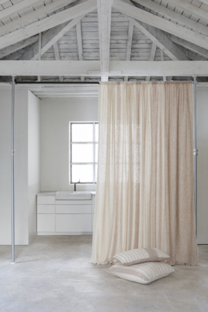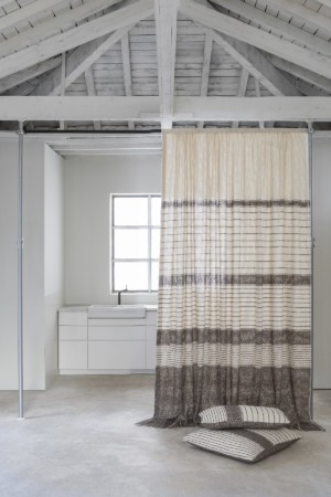 This fabric is offered in the form of panels with a rhythm of gradient stripes from the widest to the finest, which can be read vertically or horizontally.